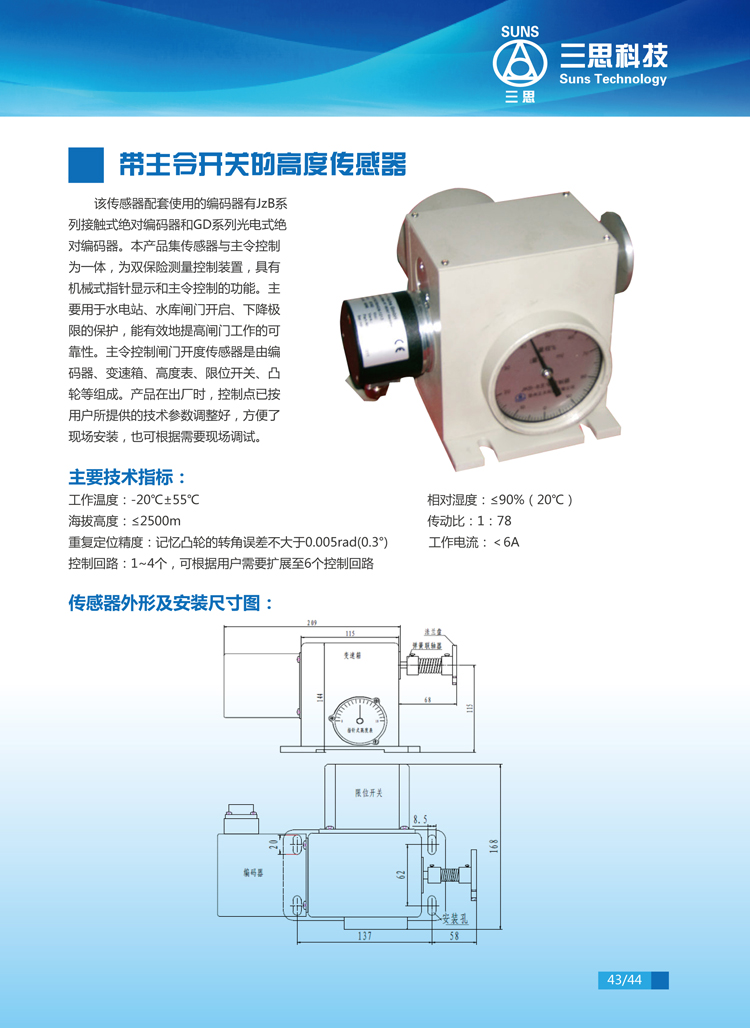 該傳感器配套使用的編碼器有JzB系列接觸式絕對編碼器和GD系列光電式絕對編碼器。本產(chǎn)品集傳感器與主令控制為一體,為雙保險測量控制裝置,具有機械式指針顯示和主令控制的功能。主要用于水電站、水庫閘門開啟、下降極限的保護,能有效地提高閘門工作的可靠性。主令控制閘門開度傳感器是由編碼器、變速箱、高度表、限位開關(guān)、凸輪等組成。產(chǎn)品在出廠時,控制點已按用戶所提供的技術(shù)參數(shù)調(diào)整好,方便了現(xiàn)場安裝,也可根據(jù)需要現(xiàn)場調(diào)試。