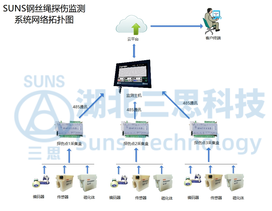 SUNS鋼絲繩探傷監(jiān)測(cè)系統(tǒng)由多部分(可選配)軟硬件組成,分別為鋼絲繩探傷傳感器與磁化體、行程編碼器、數(shù)據(jù)監(jiān)測(cè)主機(jī)、物聯(lián)云平臺(tái)。